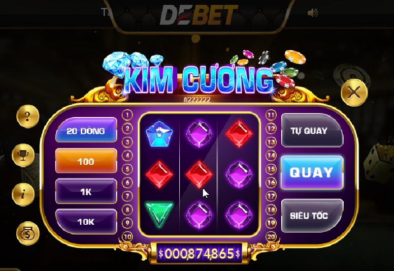 Kim Cương là game slot độc đáo với lối chơi xếp hình thú vị, kết hợp giữa trò chơi match-3 truyền thống và slot hiện đại. Với giao diện sang trọng được điểm xuyết bởi những viên kim cương lấp lánh nhiều màu sắc, game mang đến không gian giải trí đẳng cấp cho người chơi tại nhà cái Debet.